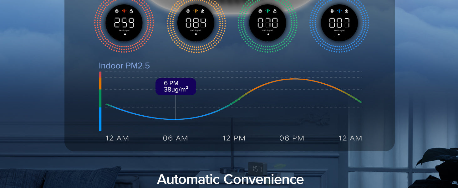 - ใ๐๐ฎ๐ฆ๐๐ง๐ข๐ณ๐๐ ๐๐๐ฌ๐ข๐ ๐งใ- The screen design at the top makes it easier for you to operate the purifier. With the light sensor, open the light detection in the APP. When the room is dimly lit(such as night), the display light will be automatically turned off and the high and turbo files will not be used in automatic mode