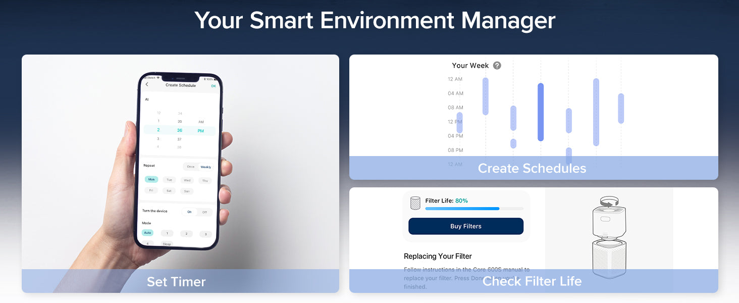 - ใ๐๐ฎ๐ฉ๐ฉ๐จ๐ซ๐ญ ๐๐๐ ๐๐ง๐ ๐๐จ๐ข๐๐ ๐๐จ๐ง๐ญ๐ซ๐จ๐ฅใ- We provide a smarter way to use for your daily purification. Using the free VeSync APP, you can remotely control the Core 600S and realize functions such as timing and creating schedules. You can connect Alexa or Google to switch on and off the purifier and switch gear speeds