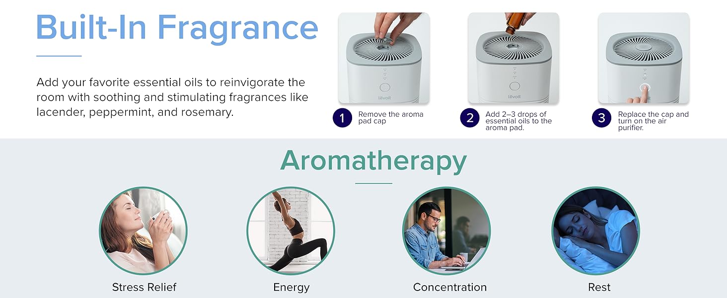 - ใ๐ ๐ ๐ฎ๐ง๐๐ญ๐ข๐จ๐ง๐ฌ ๐ข๐ง ๐ใNot only an air purifier but also an aroma diffuser. When you want to use the aromatherapy function, add 2-3 drops of your favourite essential oils (Not Included) to the aroma pad under the cover . Then the air cleaner will diffuse the clean air and fresh fragrances into the room