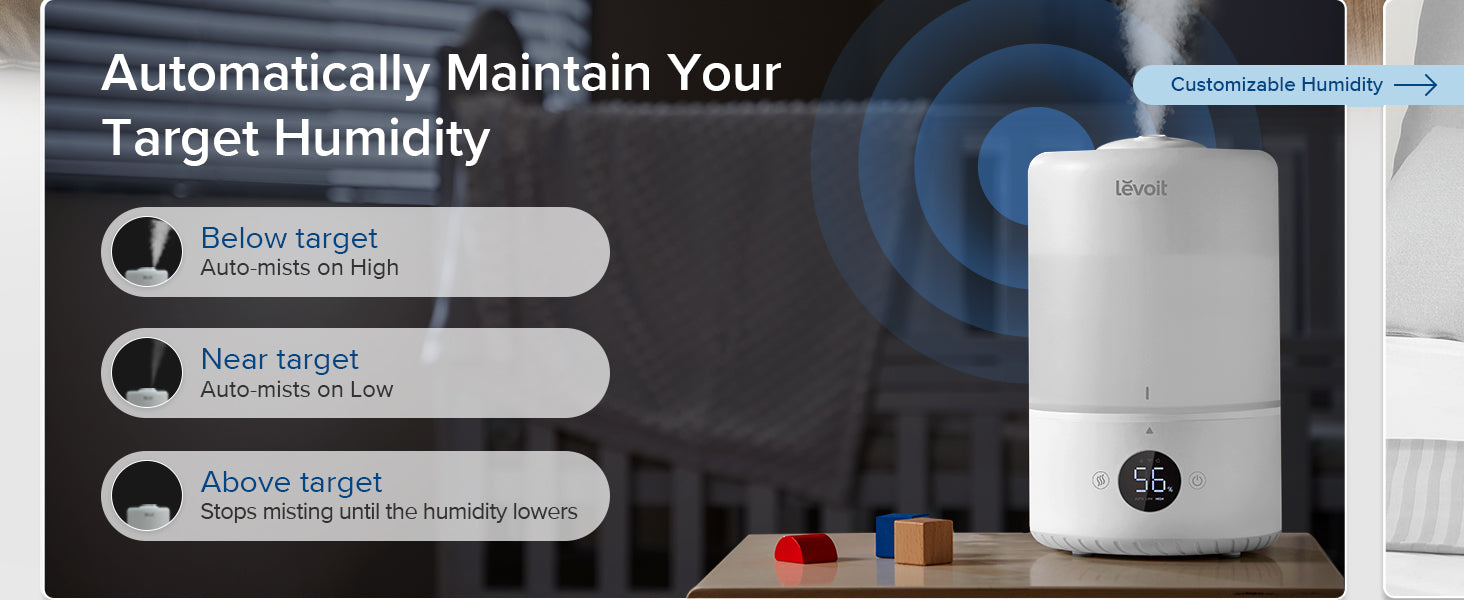 - Special feature: Humidifier & essential oil diffuser 2-in-1, Easy to disassemble and clean, 3 L water tank capacity, Run time up to 25 hours, Effective range of 27 m², 3 Cool mist speed settings, Top-Fill design, Auto shut off when water runs out