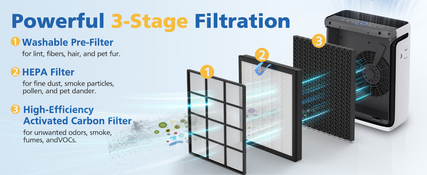 - 【Upgraded Smart Technology】 Our Poewerful Effective Filter captures 99.97% of dust and allergens as small as 0.3 microns, such as household dust, pet dander, mold spores and plant pollen.