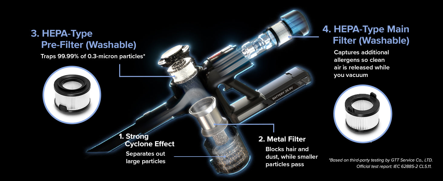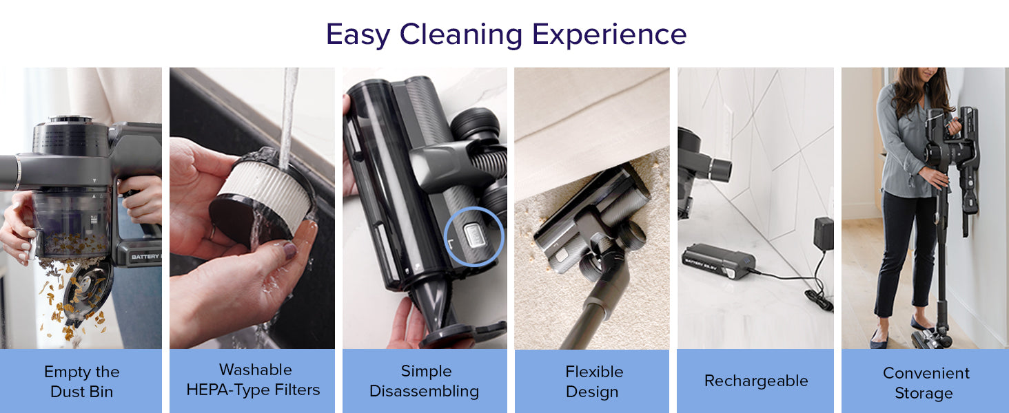 - Included components: Extension Hose, Vacuum Head for Hard Floors, Extra Battery, Motorized Mini Brush Tool, Precision Head, 2-in-1 Dust Cleaning Brush and Bonus HEPA Type Pre-Filter